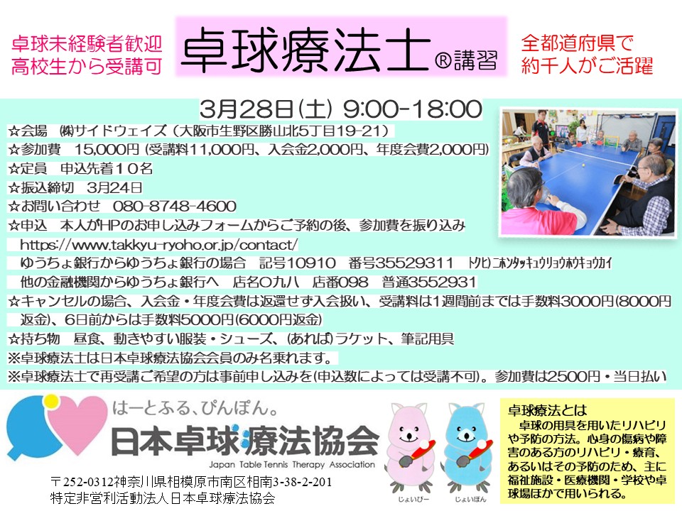 ※卓球療法士で再受講ご希望の方は事前申し込みを(申込数によっては受講不可)。参加費は2500円・当日払い