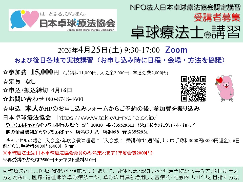 4/25(土) 卓球療法士講習 Zoom