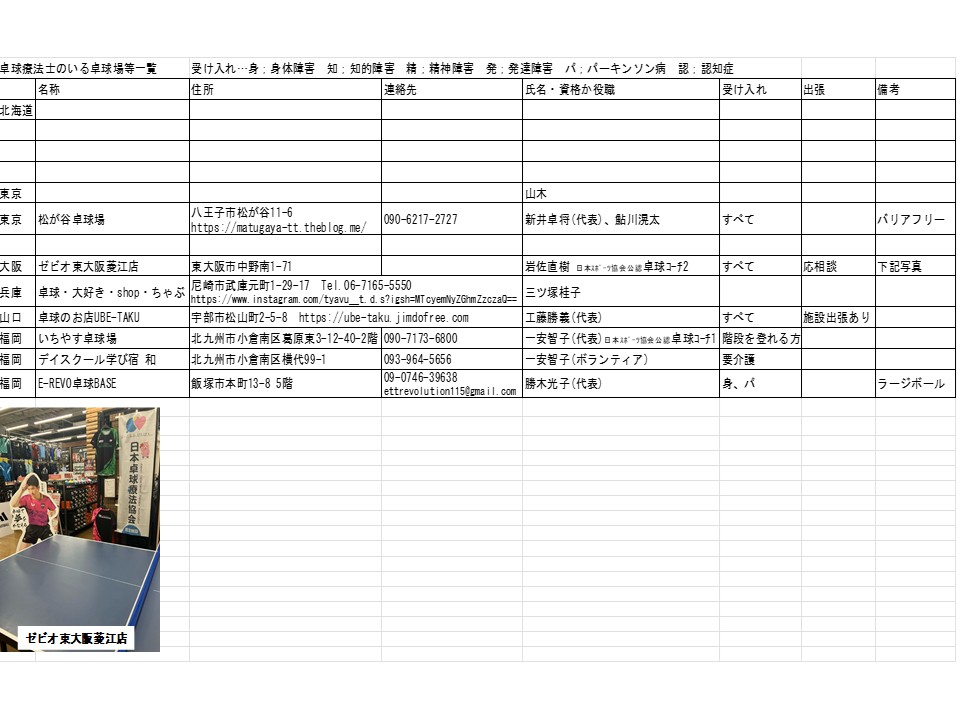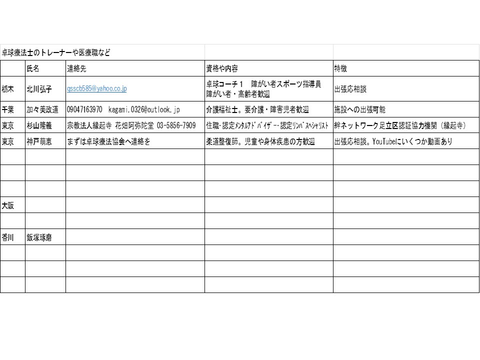 お知らせ HOMEお知らせ一覧お知らせ詳細 会員情報;卓球場やトレーナー等一覧案 障害・疾患ある方から「卓球や卓球療法をできるところは?」とのご相談に対応する情報一覧をホームページで公開したく、掲載希望の方は、掲載内容をお知らせください。 イメージを添付しますのでご参照ください。 2026.04.16 一覧に戻る information お知らせ 講習情報 お問い合わせ ぜひお気軽にご相談ください 受講・参加について お問い合わせ・お申込み 病院・施設や大学・企業のご担当者様へ お問い合わせ